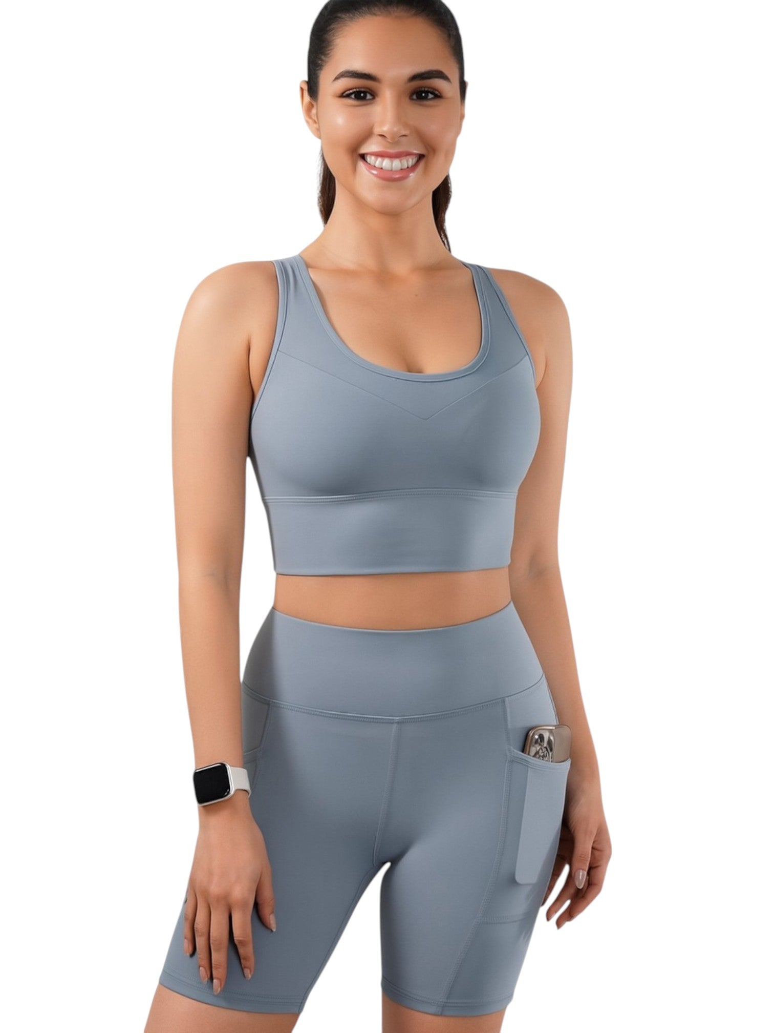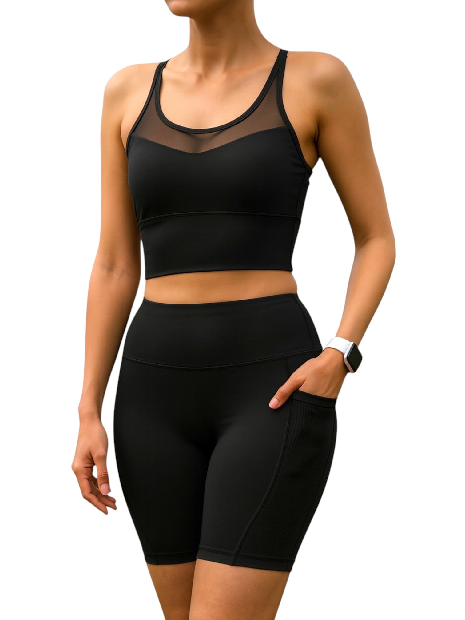 2-Piece Activewear Set- Criss-Cross Mesh Sport Bra & High-Waisted Biker Shorts- Side pockets- Yoga, Workout, Running